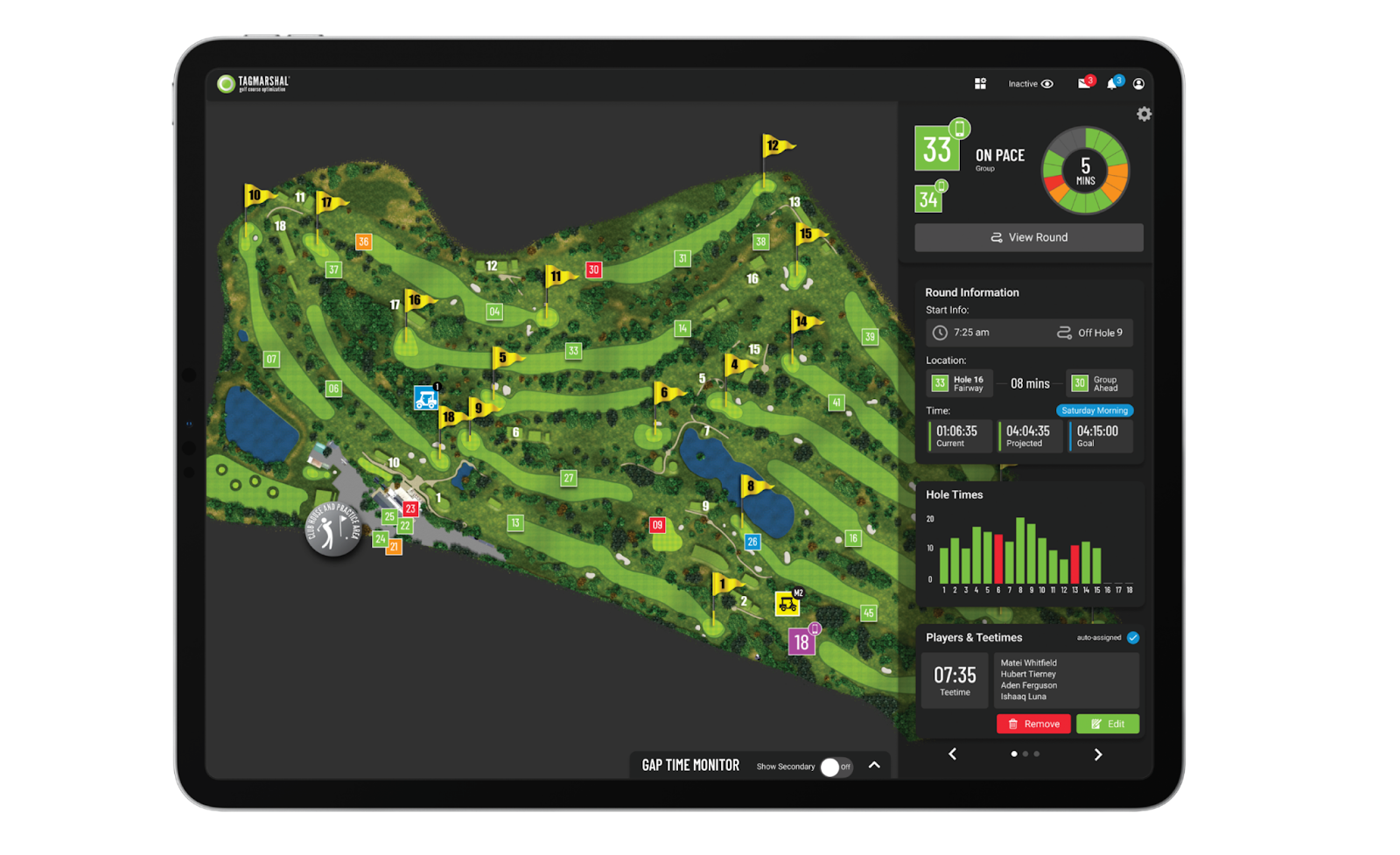 Using real-time, automated alerts, Tagmarshal’s system reduces the effort needed to monitor pace and flow, making it easy for staff to perform additional tasks while keeping an eye on the field in real-time from the pro shop or clubhouse.